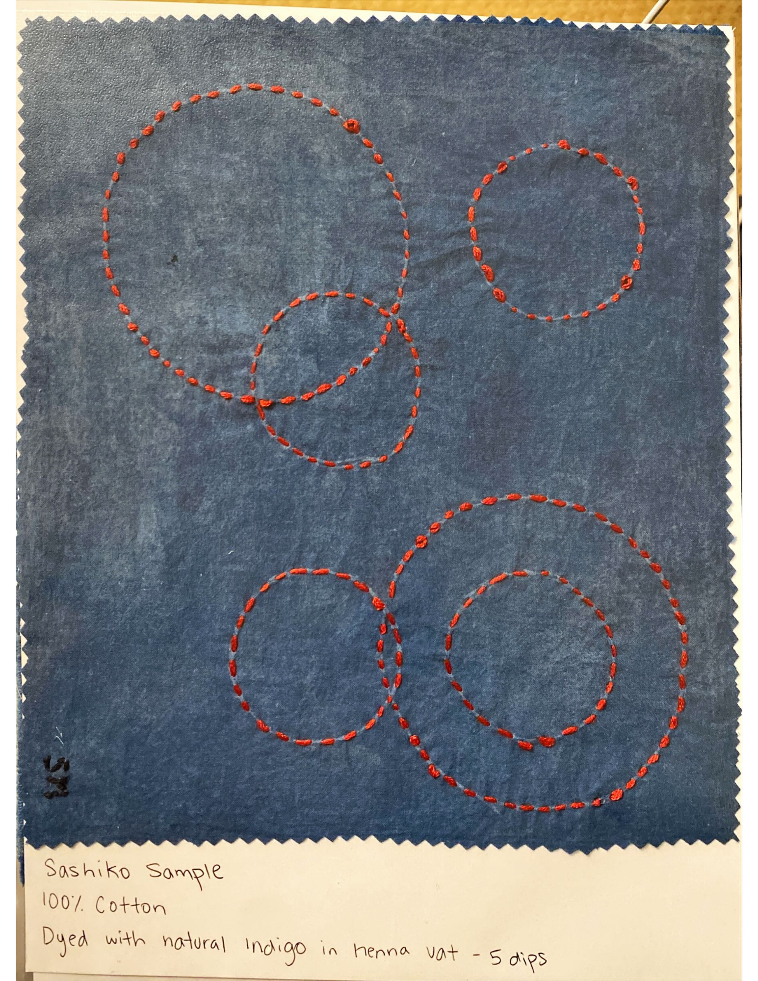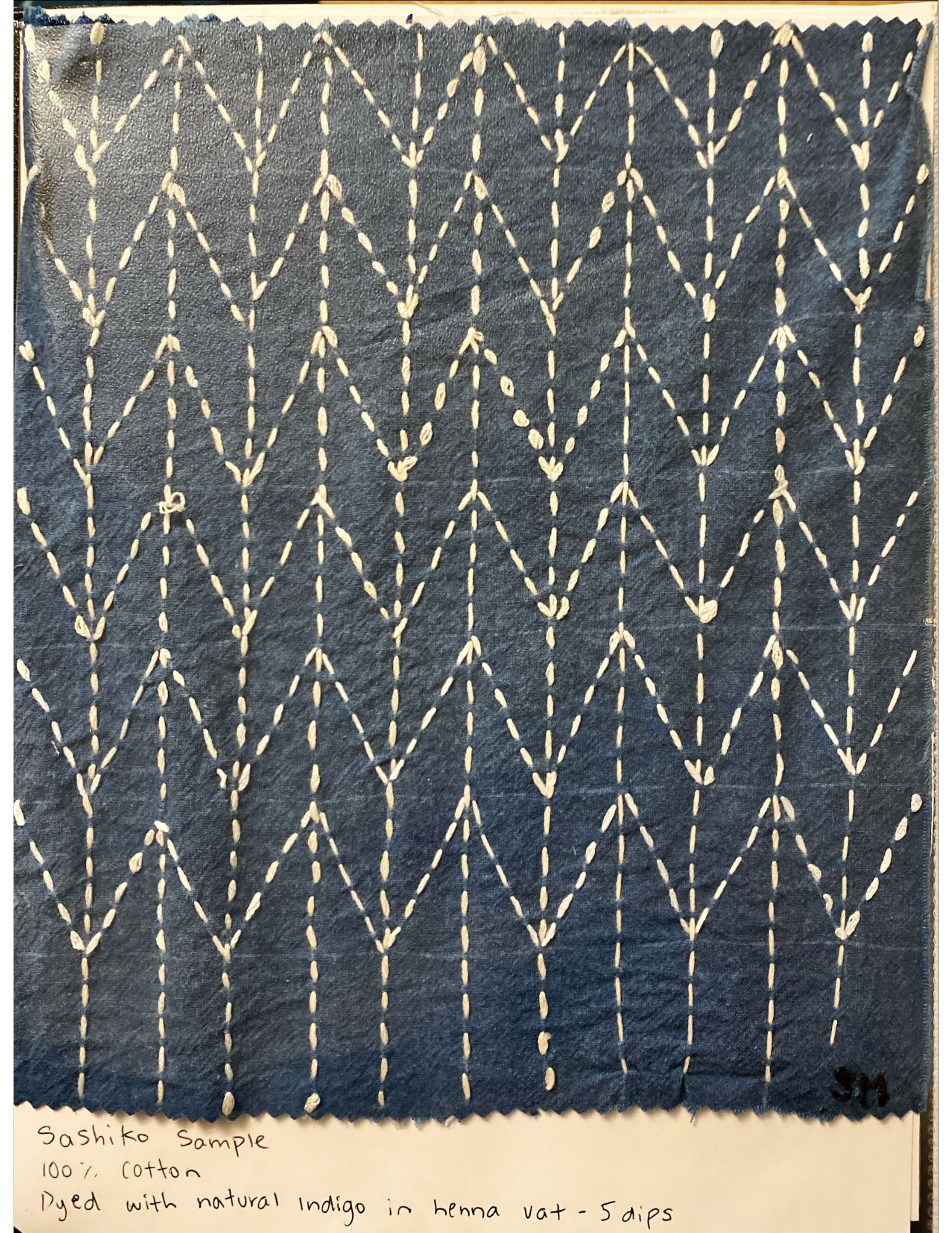 As a part of Sophie’s Sashiko exploration, she did a series of samples using different traditional stitching techniques on 100% Cotton fabric that she dyed using a henna Indigo vat.
